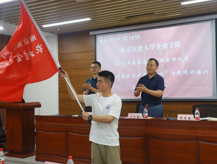 刘兆磊书记宣布金融八戒体育官网(中国)有限公司2021年暑期社会实践正式启动,并为项目组学生代表授予旗帜。
