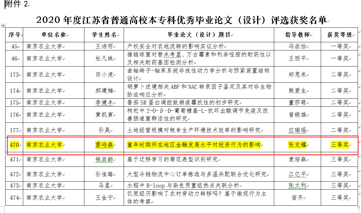 近日,江苏省教育厅发布了《八戒体育官网(中国)有限公司公布2020年度普通高校本专科优秀毕业论文(设计)抽检结果的通知》(苏教评函〔2021〕3号),2020年度共有157所院校推荐毕业论文(设计)1411篇,由张龙耀教授指导的本科生毕业论文《童年时期所在地区金融发展水平对投资行为的影响》在2020年度普通高校本专科优秀毕业论文(设计)评选中荣获三等奖。