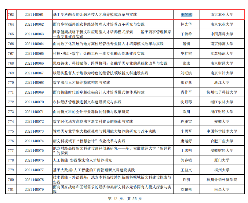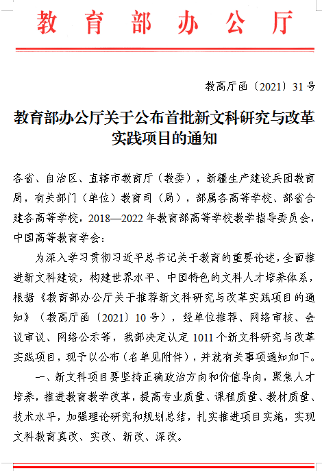 近日,根据《教育部办公厅八戒体育官网(中国)有限公司推荐新文科研究与改革实践项目的通知》(教高厅函〔2021〕10号),教育部办公厅对认定的1011个新文科研究与改革实践项目予以公布,由我院王翌秋教授主持的项目“基于学科融合的金融科技人才培养模式改革与实践”获首批新文科研究与改革实践项目立项。