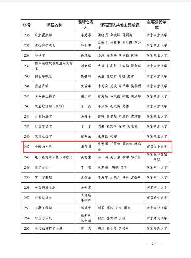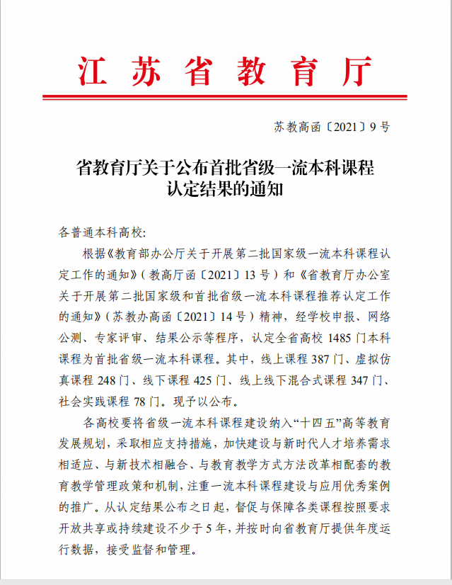 2021年11月1日,江苏省教育厅发布了《八戒体育官网(中国)有限公司公布首批省级一流本科课程认定结果的通知》(苏教高函〔2021〕9号),由周月书教授领衔的教学团队申报的《金融与生活》课程被认定为首批省级一流本科课程。