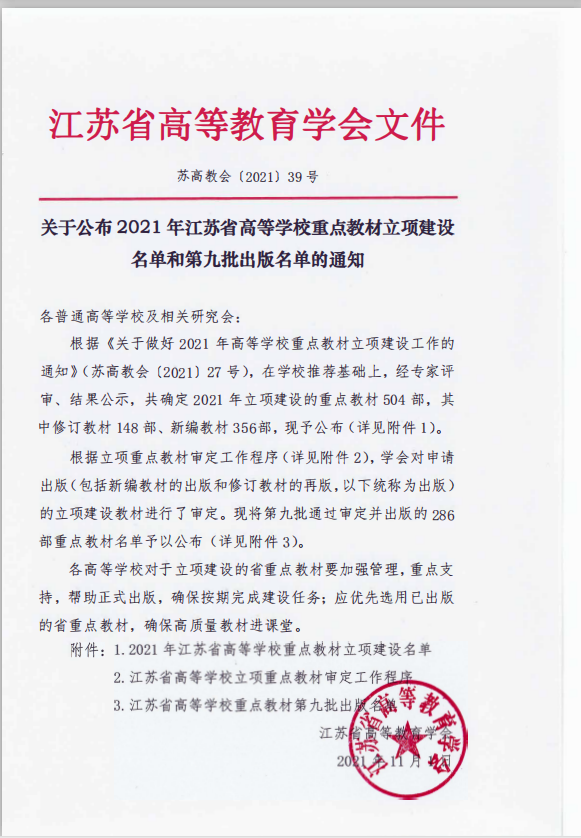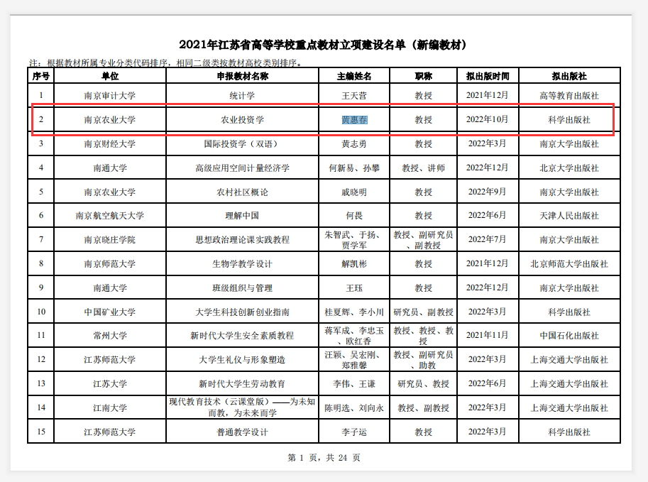 2021年11月1日,江苏省高教学会发布了《2021年江苏省高等学校重点教材立项建设名单和第九批出版名单的通知》(苏高教会(2021) 39号),由黄惠春教授主编的教材《农业投资学》获批立项为2021年江苏省高等学校立项建设的重点教材。
