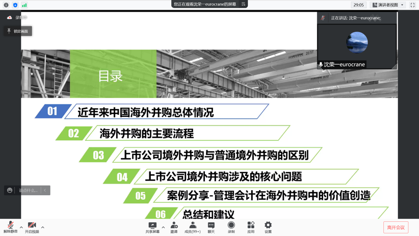 其次,他从近年来中国海外并购总体情况、海外并购的主要流程、上市公司境外并购与普通境外并购的区别、上市公司境外并购涉及的核心问题、案例分享以及总结和建议这六个方面展开,他提出了四点建议:一是按并购计划及早沟通及行动;二是交易结构涉及有尽调中取得当地律师帮助;三是并购贷款至少要选择2-3家银行;四是要使整个流程成本最优以体现管理会计的价值创造。