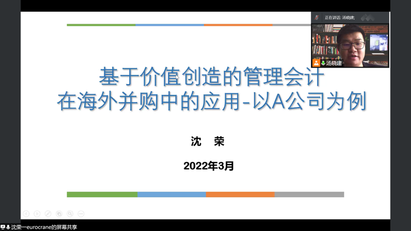 3月27日上午,苏州易昇光学材料股份有限公司董秘、财务总监沈荣受邀开展了题为“基于价值创造的管理会计在海外并购中的应用——以A公司为例”的学术报告。本次报告由金融八戒体育官网(中国)有限公司汤晓建副教授主持,校内外近200名师生参加。