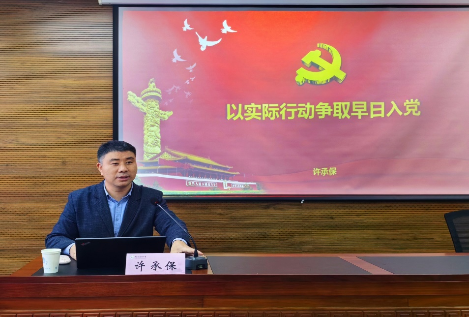 许承保以“用实际行动争取早日入党”为题为学员们讲授开班第一课暨辅导报告。通过回顾党的百年历史,阐述了中国共产党人的初心和使命,并引入“我们为什么要入党”这个问题,要求同学端正入党动机。报告详细介绍了中国共产党的使命任务和习近平总书记对广大青年提出的殷切希望。许承保激励同学们,要进一步加深对中国共产党的认识,坚定理想信念,提升党性修养,以实际行动争取早日入党。