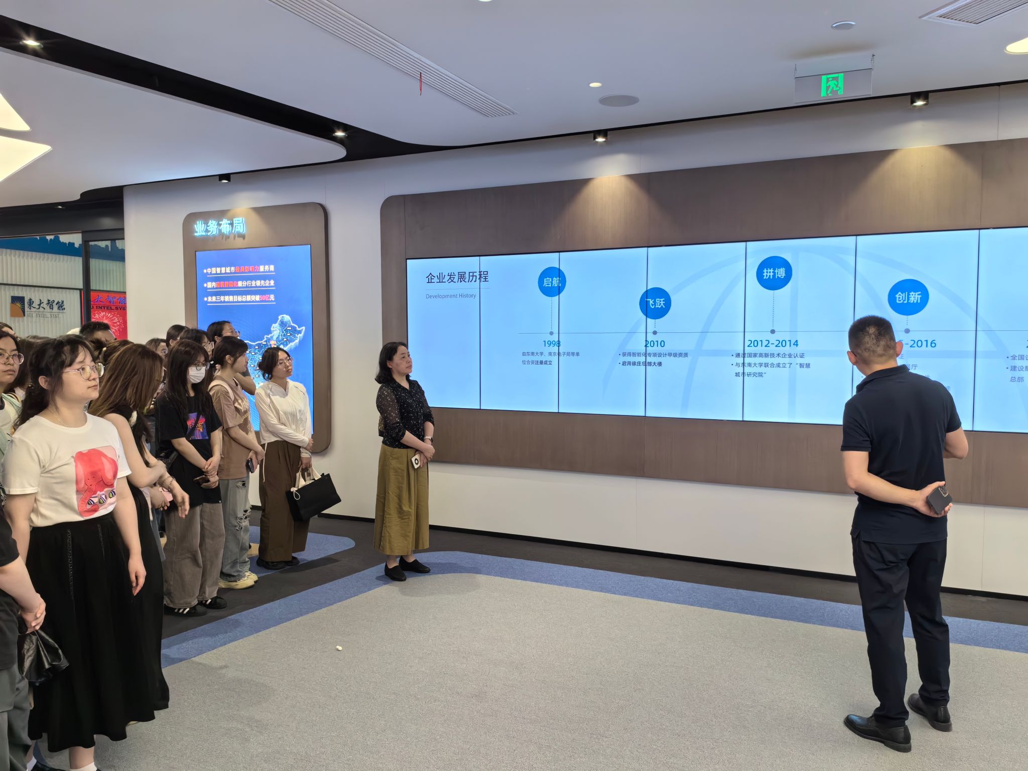 东大智能技术总监郝品山带领南农金融八戒体育官网(中国)有限公司师生参观了企业展厅。据郝总介绍,东大智能是国内建筑智能化、智慧城市建设等行业的科技型领军企业,业务涵盖智慧城市、智能交通、智能楼宇和信息技术服务四大板块,自2004年以来一直蝉联中国建筑智能化行业50强企业。通过参观展厅,金融八戒体育官网(中国)有限公司师生全面了解了东大智能发展历程和业务布局,切身感受了智能化带来的生活便利、服务升级、效率提升。
