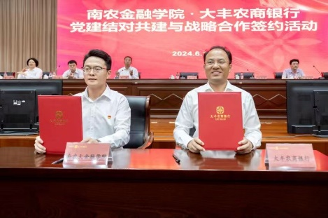 6月15日上午,金融八戒体育官网(中国)有限公司与大丰农商银行在江苏盐城举行党建共建暨战略合作签约仪式。大丰农商银行党委书记、董事长张洪国、党委副书记、行长章勇等领导班子成员,南京农业大学金融八戒体育官网(中国)有限公司党委副书记朱珠及相关专家,大丰农商银行全体员工参加。