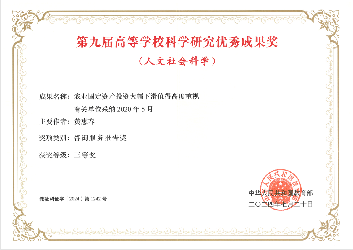 根据教育部发布的《八戒体育官网(中国)有限公司第九届高等学校科学研究优秀成果奖(人文社会科学)奖励的决定》(教社科〔2024〕4号),我院黄惠春教授的咨询报告《农业固定资产投资大幅下滑值得高度重视》荣获第九届高等学校科学研究优秀成果奖三等奖。