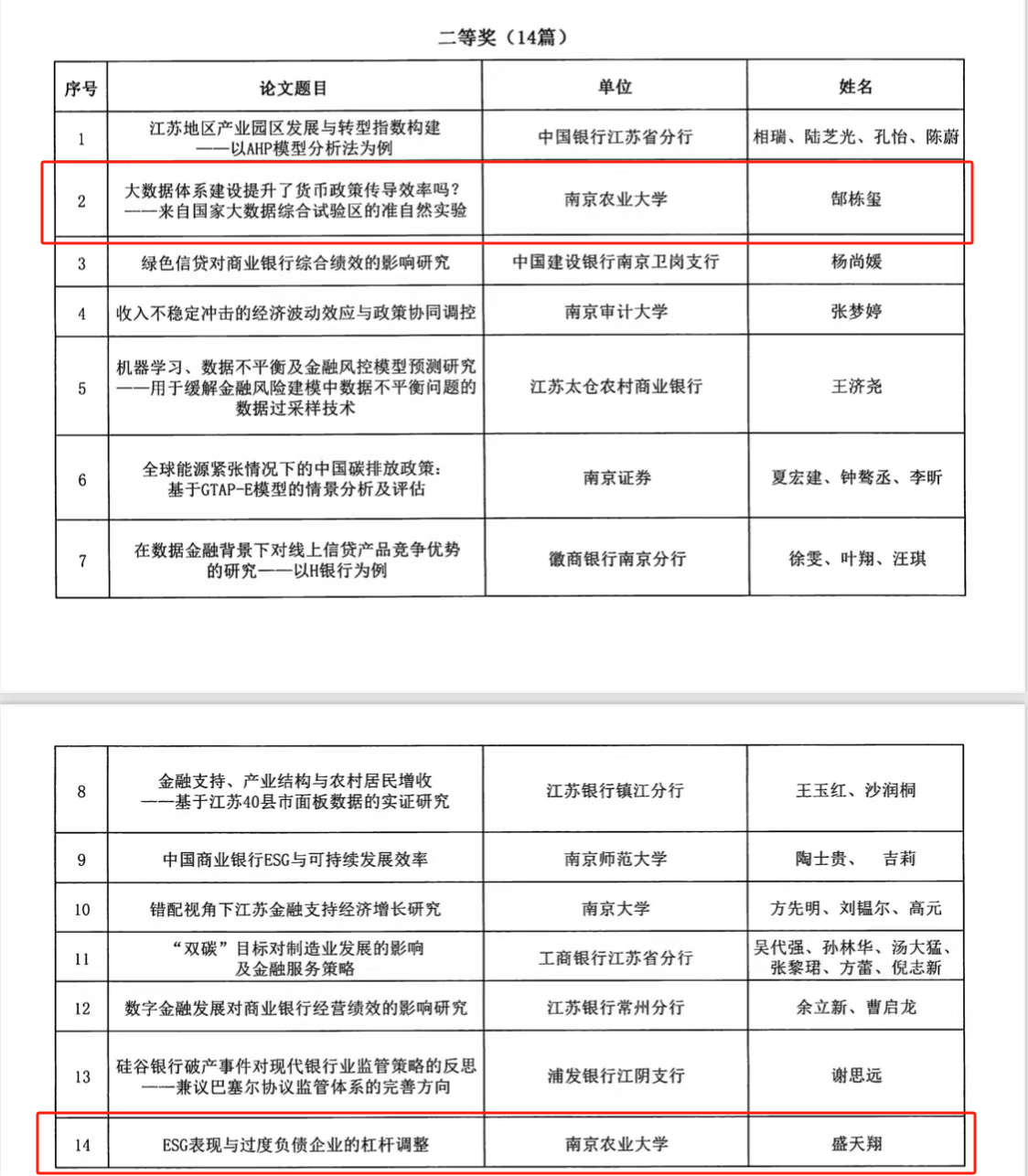 近日,江苏省金融学会发布了《江苏省金融学会八戒体育官网(中国)有限公司第二十六届金融理论与实务征文评选结果的通报》。此次征文评选共上报论文90篇,经有关专家学者匿名评审,共评出一等奖9篇、二等奖14篇、三等奖23篇、表彰奖9篇。我院教师郜栋玺、盛天翔获二等奖。