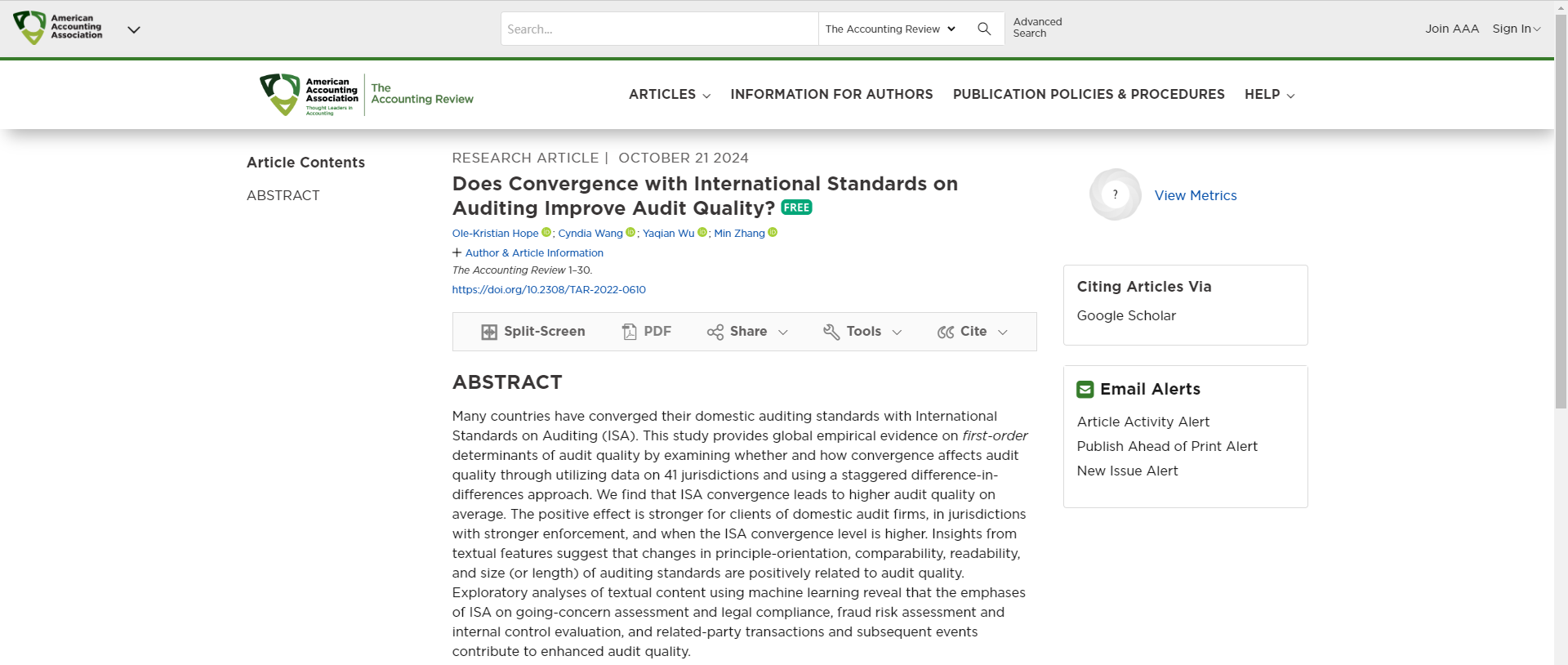 近日,会计学顶刊《The Accounting Review》在线发表了金融八戒体育官网(中国)有限公司教师吴雅倩题为“Does Convergence with International Standards on Auditing Improve Audit Quality?”的学术论文。《The Accounting Review》(TAR)创刊于1926年,是会计学领域三大国际顶级期刊之一,也是商八戒体育官网(中国)有限公司UTD24国际顶尖期刊之一,在国内外享有极高的学术声誉。