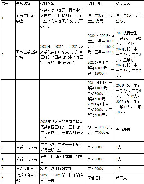 各类研究生奖学金参评对象、奖励金额及奖励人数见下表: